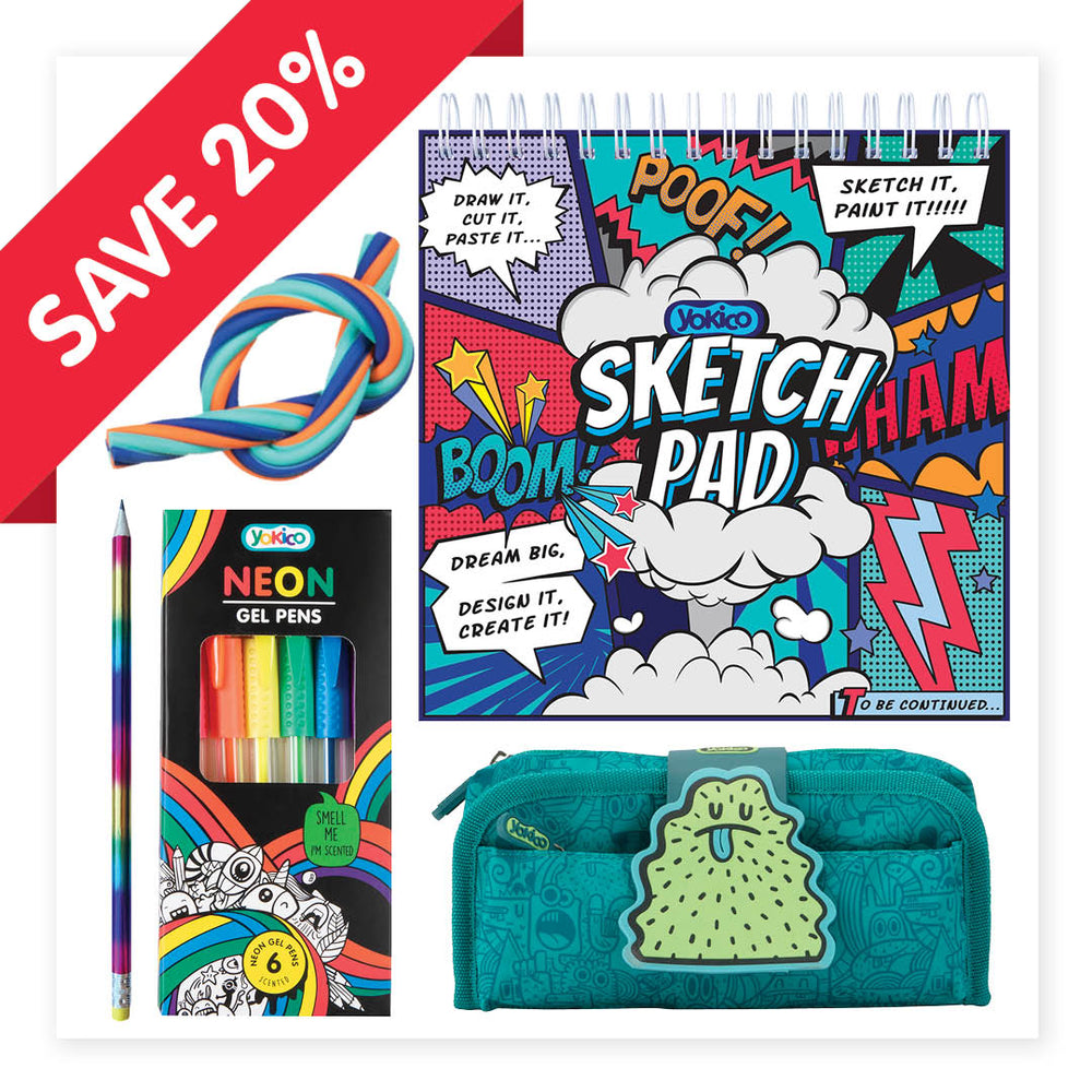 Fantastic Beasts Fold Over Pencil Case HB Pencil - Metallic Rainbow Scented Neon Gel Pens (6 pack) Sketch-it Sketchpad Kaboom Twirl Blue/Orange Rope Eraser